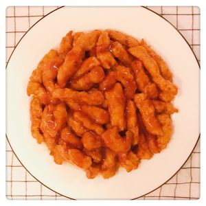 炸好的里脊肉倒入锅内,翻炒,确保所有的里脊肉条都裹上糖醋汁。