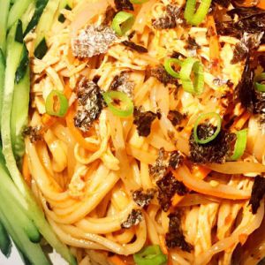 面条沥干水分,加入豆芽,胡萝卜丝,鸡丝。调入辣椒油,花椒油,香油,焙煎芝麻沙拉汁,香醋,蒸鱼豉油,捞汁,熟芝麻,白胡椒,盐,白糖,鸡精。