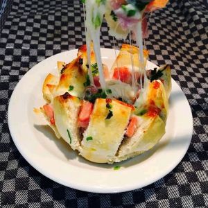 一层奶酪一层火腿,填满满,然后撒上葱花