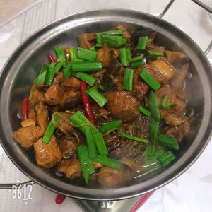 把肉盛出,油留锅中,放入冰糖,炒糖色,放入肉。放肉八角,煸炒,放入生抽老抽煸炒一会,把香菇倒入煸炒一会。倒入开水,与菜平行,大火烧开,小火慢炖,半小时后放点盐,倒入粉丝,粉丝放上面,大火收汁,出锅放蒜叶。完成!