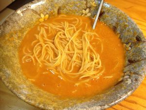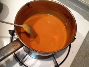 在高汤中加入沙茶辣,搅拌均匀;用文火煮开,加入辣椒面,椰子粉,边搅拌边煮,煮上10分钟