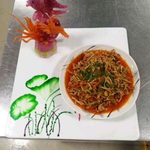 鱼泡椒剁碎,猪里脊肉切丝,青笋切丝。