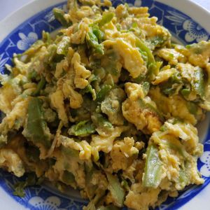 腌过的苦瓜 用清水冲洗两遍,攥干水份,把鸡蛋打到碗里,加适量盐打散备用。