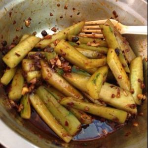 准备一只碗,放进青瓜,先放盐和蒜(切粒)捞一两分钟,再放开两汤匙老干妈即可食用,如想味道浓一点的,拌好后放进冰箱腌15分钟,味道更浓
