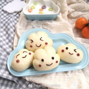 至于云朵表情可以发挥想象 利用两色面团 用小镊子夹取 面团表面涂点牛奶 把表情轻轻按压实