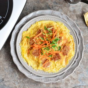 调到小火,把3个鸡蛋用筷子打散,慢慢浇至丸子上面