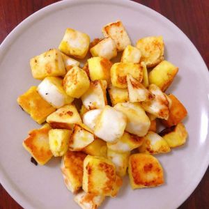 锅内倒油,裹满鸡蛋液的馒头丁倒入