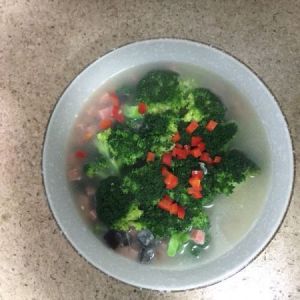 水开后放盐调味,再放入汆熟的西兰花等水再次开即可起锅。在西兰花上洒一些红椒末点缀。颜色就很好看了。