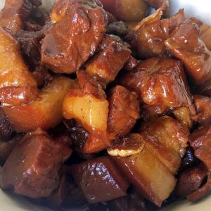 炒片刻出锅,另起油锅炒糖色,冒泡下肉,加生抽、料酒、醋、老抽,加开水至没过肉,大火烧开,小火炖煮一个半小时。