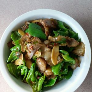 锅烧热下切好的肉片加姜末花椒粒少许爆炒,出油炒至肉片微卷起锅备用