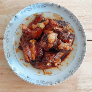 带排骨微微变色后加入酱油、醋,翻炒几下,依各自口感加适量水,(我是加一半的水,没有没过排骨)