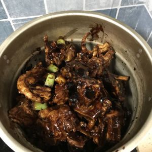 加入甜面酱,冰糖,把酱炒熟,放入焯过了的羊蝎子,加入白酒,老抽,蚝油,生抽,翻炒均匀。