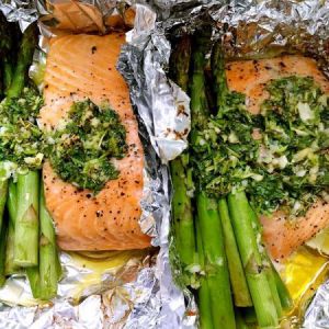 处理好的芦笋摆在鱼边上,放上拌匀的酱,芦笋我放多了,可以适当减掉些