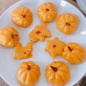 南瓜和粉揉好后,随便你做造型。因为是临时想起做,所以没有准备红豆和面包糠
