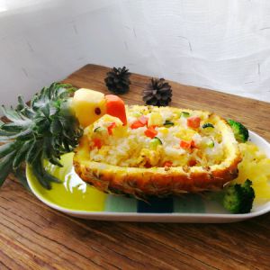 炒好后装入菠萝容器中,我做的量比较大,装入一半,剩下的一半直接整盘了。其实到这一步就可以直接食用了,但我们有条件的话,要再加一步。