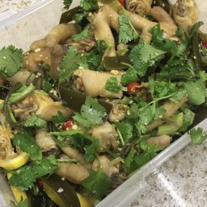取一大号保鲜盒,调佐料:加入生抽、米醋、香菜、料酒、姜蒜末拌匀,然后加入鸡爪、香菜、海带、小米辣,挤入柠檬汁(挤完后剩余的柠檬片也放进去,用手拌匀,盖盖密封,放冰箱冷藏过夜