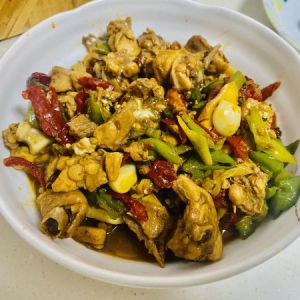 炒至鸡肉几乎没有水分时倒入青椒翻炒,然后加入一罐啤酒并加入葱姜蒜一起焖煮。