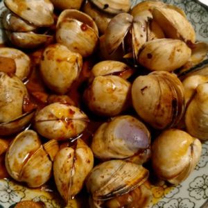放入花蛤 加入料酒翻炒 料酒的量看个人喜好 我加的比较多 翻炒到部分花蛤开口 然后继续加水或者料酒焖锅两分钟