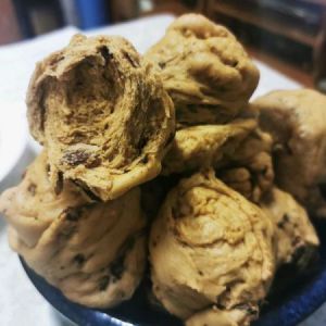 接着揪成若干个小剂子,下完剂子,轻震一下,切面朝上。