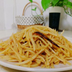 两个中等土豆削皮擦成丝,用水冲洗两遍备用。葱姜蒜切末,辣椒剪成丝