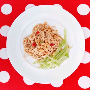冷却后的面,与鸡肉丝,放入之前调制好的酱汁中,均匀搅拌