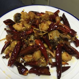 这时候一定是小火,不然辣椒容易糊。待辣椒变色出香味后,放入鸡块,少量盐和糖调味。