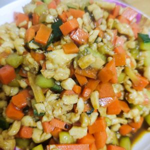 加入鸡胸肉 炒至颜色发白后放入胡萝卜丁