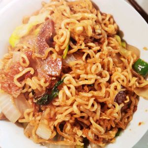 放入盐,耗油和两包方便面里面的酱包,记住只要酱包就好,然后再次翻炒均匀
