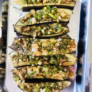 取出茄子将上面的酱汁均匀涂抹在茄子上,放入烤箱,160度上下火中层烤制10分钟。