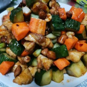 然后加一点水,加入炸好的鸡丁黄瓜等。翻炒,加入糖,醋。出锅前加少于水淀粉即可