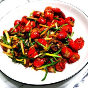 待汁水收尽后,加入香葱段。翻炒半分钟,盛出。