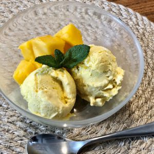 选个好芒果,切果肉,用料理机打成糊备用。称了下芒果糊重300g