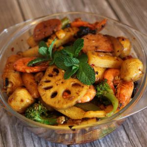 翻炒均匀,因香锅底料本身有咸味,加入食材后咸淡正好,就没有另加盐及其他佐料了~