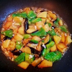 把调好的汁水 倒入锅中 小火翻炒均匀