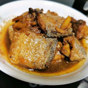 重起油锅,放入带鱼、姜、蒜、料酒、生抽、白糖,烧5分钟。再放入米醋,收汁起锅。