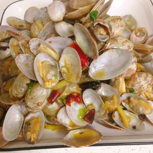 倒入洗净的花蛤,大火快炒,盖上锅盖,待到所有花蛤开口后,再继续翻炒15秒左右,花蛤翻炒的时候会出水,不需要再加水,我家喜欢吃比较鲜点的,也没有加料酒,如果觉得腥可以加点料酒