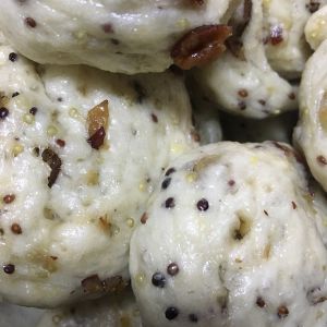 红枣剪碎,藜麦浸泡20分钟,所有食材加一起揉成光滑面团(水一点点加,我没有称重,也可以用牛奶,更香),发酵大概一个小时(看温度)