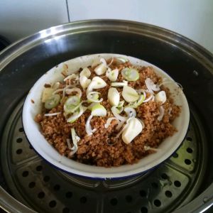 表面撒上一些葱蒜,上锅蒸。我用的就是苏珀尔普通的蒸锅,一定要倒足水啊,保证不会干锅,水开后小火继续蒸。因为喜欢吃软烂的肉,所以溜溜蒸了1.5个小时。