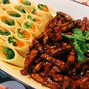 准备一块豆皮 几根香菜 小葱 胡萝卜丝 用豆皮将食材卷起