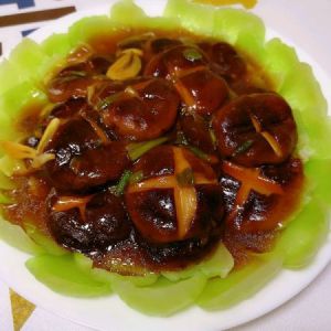 炖好的香菇和汤汁倒入摆好盘的油菜上,大功告成。