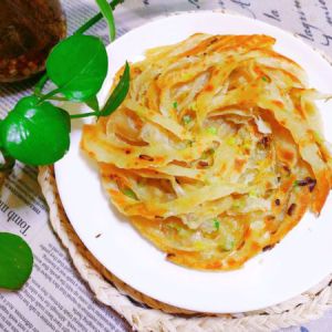 烙至两面金黄出锅,饼边向下摔两下,香酥美味的葱油饼装盘啦。