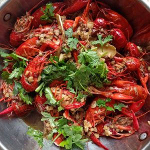 起锅烧油,依次放入花椒,香叶八角,姜片,放入蒜末,炒出蒜香味放入小龙虾,翻炒,放入耗油,生抽,在翻炒,接着倒入啤酒,大火煮10-20分钟,