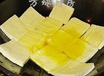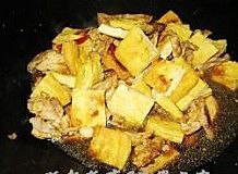 锅里放油,烧热后把豆腐干下锅炸的两面金黄,我的油放得不很多,处于半煎半炸状态。煎豆腐干的时候一定要少翻动,免得破皮。