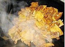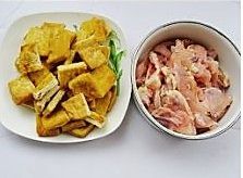 用热锅热油把姜、葱、蒜煸香,少加点糖速炒鸡小肉,待鸡肉变色后加入豆干,添汤,倒入少量酱油,烧沸后撇去浮沫;