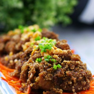 米粉打湿,将腌制好的肉片裹满米粉,码入盘中;