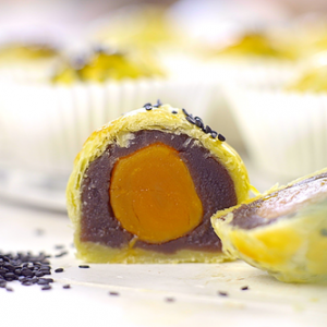 红豆沙分成约25g每份包裹烤好的咸蛋黄