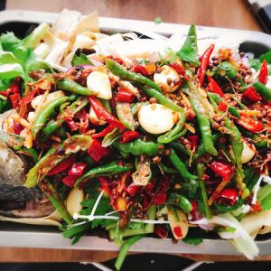 继续放辣椒段花椒,蒜头,青椒,小米辣翻炒。
