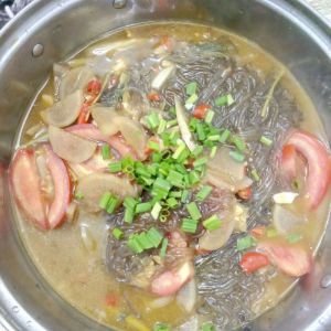锅里加油,加入小米辣,姜蒜炒出香味。倒入泡菜翻炒一分钟,加入水。然后把泡着的粉条洗一下,加入锅里。加入盐,味精,花椒油,香油等。把葱头和香菜切成断放进去。葱叶切成小段,放一边