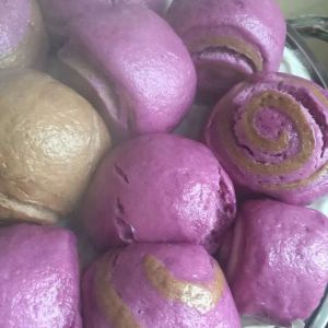 第四步:发了3种面团,紫薯面团、可可面团、白面团,紫薯和可可做了馍子,白面团做的小笼包,包子、馒头一定要动手做才会越做越好