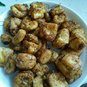 准备好烤肉酱,把锅烧热放油把豆腐泡炒脆脆的。